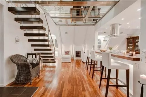 吧臺的對面是獨具特色的樓梯設(shè)計,樓梯的色彩與整體空間結(jié)合得相當(dāng)完美,古銅色帶有金屬質(zhì)感的樓梯扶手搭配實木的樓梯踏板,在加上透明玻璃鑲嵌的樓梯扶手墻面,極力呈現(xiàn)出空間的現(xiàn)代時尚感。