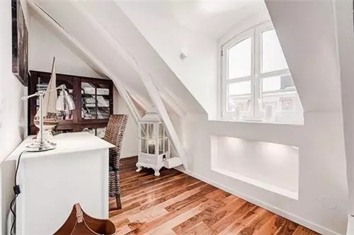 在小小的閣樓上同時還設(shè)計了一個小小的書房,雖然面積不算大,但是大片的玻璃窗設(shè)計,讓整個空間顯得寬敞明亮,斜面的屋頂打造了一個獨居特色的書房空間。