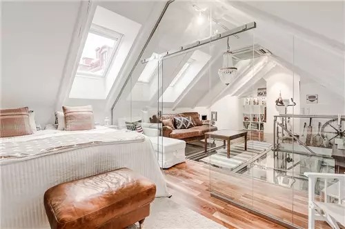 這是裝修中的閣樓部分,在閣樓設(shè)計中實際是格外的用心,運用全通明的玻璃結(jié)合桃木地板打造,濕整個閣樓空間現(xiàn)代簡約時尚感十足。臥室旁邊是一個小小的額客廳,棕色的皮質(zhì)沙發(fā)完美的融合進了空間中,顯得時尚大氣。