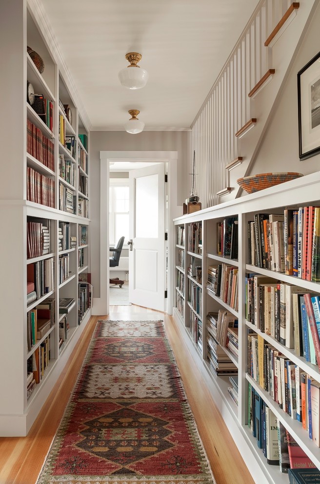 小戶型騰不出書(shū)房的空間,走廊就要好好利用起來(lái),整墻書(shū)柜或者簡(jiǎn)單的書(shū)架,都能讓你的藏書(shū)有容身之所。