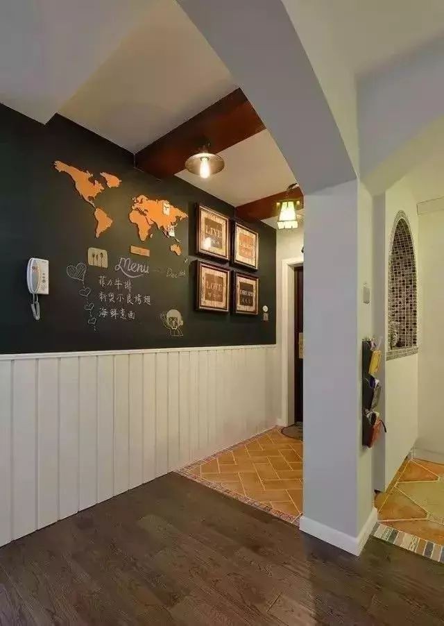 ▲ 玄關(guān)是布置黑板裝飾的入門(mén)級(jí)空間,能夠讓人從進(jìn)入玄關(guān)的一刻就感受到主人的生活氣息和創(chuàng)意,還能記事備忘,如需要買(mǎi)的物品、繳費(fèi)等。如果用磁性黑板漆或帶收納的黑板架,能把單張備忘貼在上面,變成家庭信息集中地。