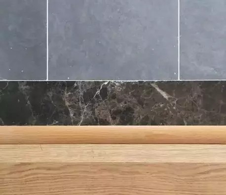 利用金屬(最好是不銹鋼材質(zhì))的收邊條,把木地板和瓷磚隔開,同時(shí)密封好瓷磚和收邊條之間的縫隙,視覺上沒(méi)有門檻石那么扎眼。收邊條可以比地板和瓷磚都稍微高一些,保護(hù)兩邊的邊緣。