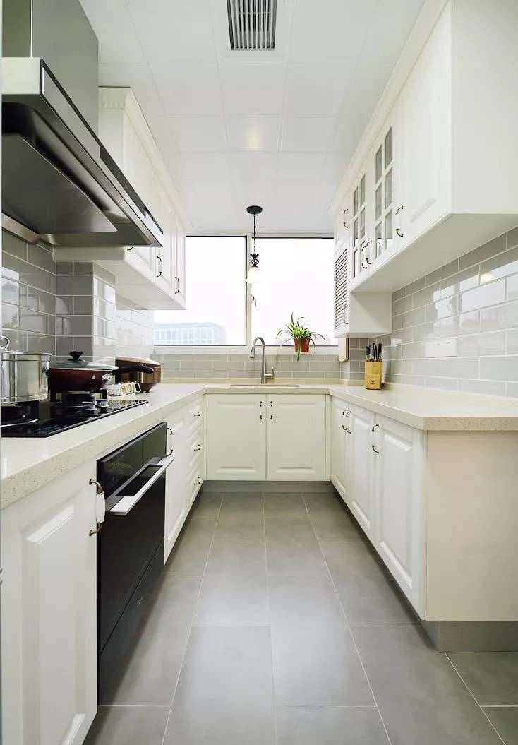 廚房采用了灰色的地板,低調(diào)大氣又耐臟,白色的櫥柜整齊擺放,可以容納兩個(gè)人同時(shí)在廚房忙碌。
