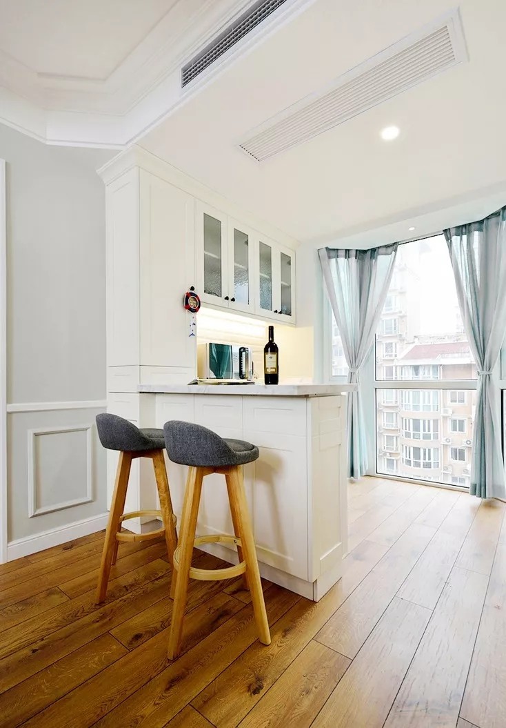 餐桌邊有一個(gè)西式的小吧臺(tái),平時(shí)朋友客人來了,坐在這里喝點(diǎn)小酒,聊聊天,享受下午時(shí)光,旁邊的落地窗補(bǔ)充了光線。