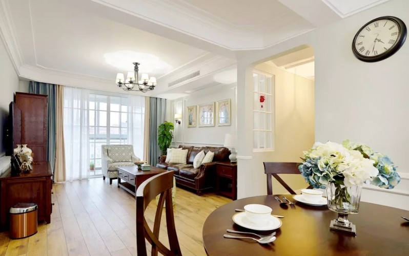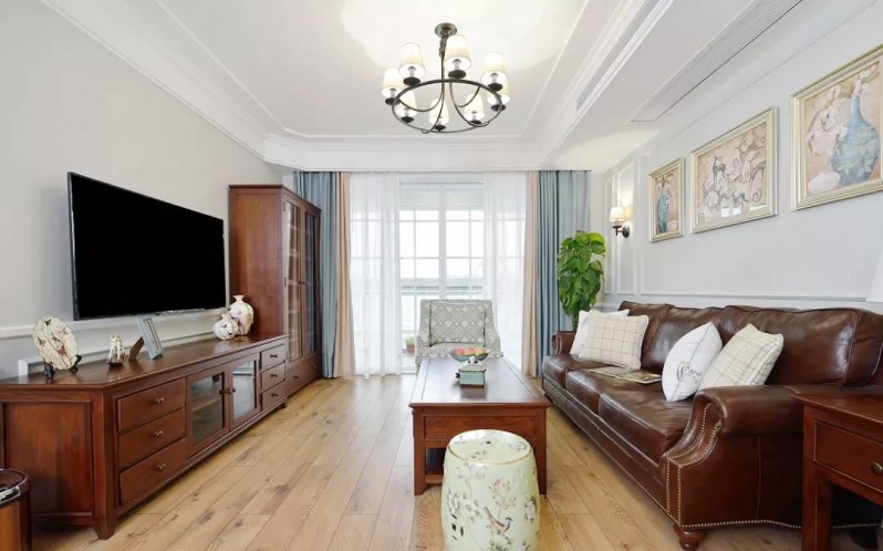 客廳的木質(zhì)家具有點(diǎn)像中式風(fēng),深棕色的皮質(zhì)沙發(fā),旁邊的鉚釘體現(xiàn)了美式風(fēng)格重視細(xì)節(jié)的特點(diǎn)。