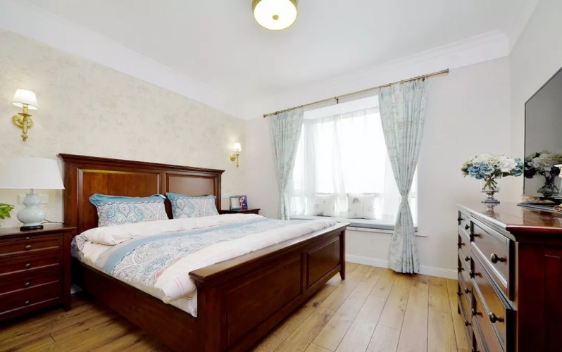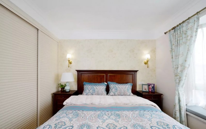 主臥室很素雅,窗簾和床頭背景墻都是采用的小碎花,保證采光性的同時(shí)還保護(hù)了隱私性。