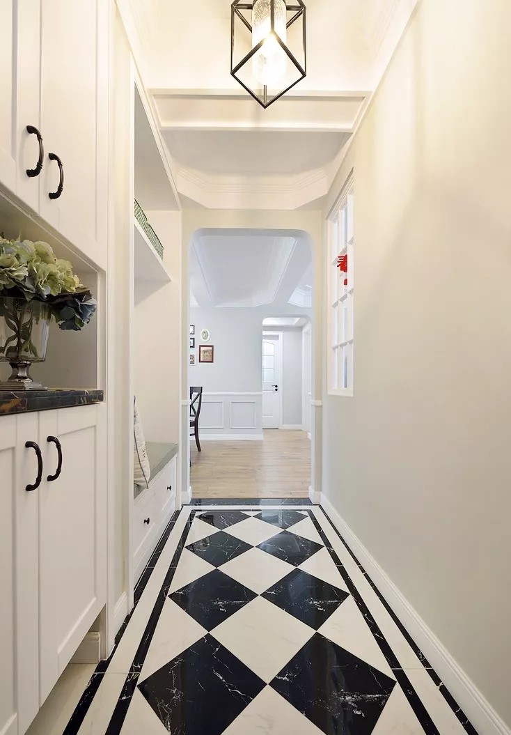 造型獨(dú)特的吊燈也是精心挑選的,地板是采用的黑白格子的,對稱鋪滿,整齊大氣有質(zhì)感。