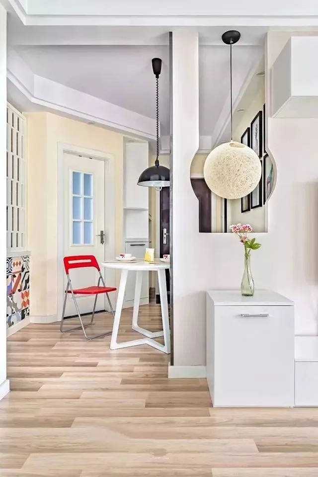 客廳與餐廳之間的墻被打通了一塊,掛上一盞球形的竹籃吊燈,一進(jìn)大門就看到這樣一個(gè)若隱若現(xiàn)的一幕,顯得優(yōu)雅格外。
