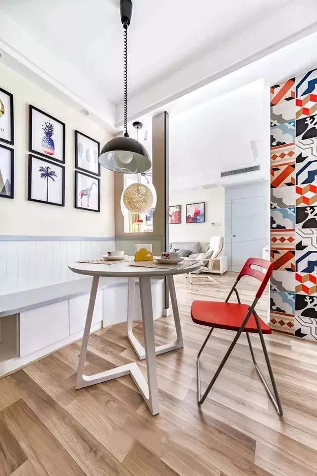 小小的餐桌,搭配一張簡(jiǎn)易小椅子,還有一排收納卡座,緊湊的小空間也充滿了情趣。