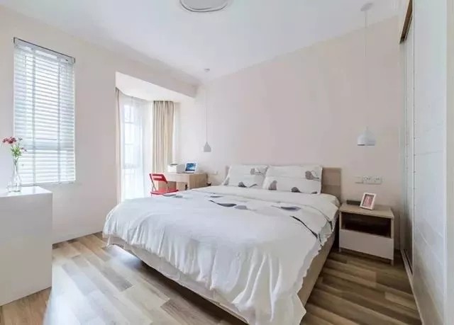 臥室在淡粉色的墻面下,用淺木色地板搭配原木質(zhì)的床,裝扮出一個(gè)溫馨優(yōu)雅而浪漫的休息空間。