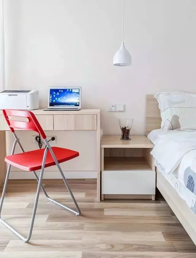 床頭兩側(cè),分別是床頭柜與小書桌,搭配上垂下來(lái)的吊燈,顯得更有空間感。
