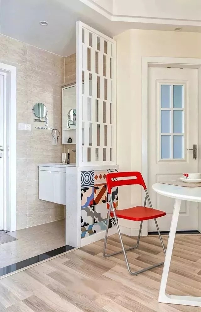 餐廳與洗手盆之間的墻面貼的彩色花磚,結(jié)合一款鏤空隔斷,使空間更加通透。