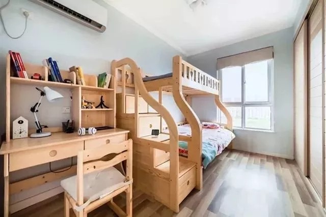 兒童房以淡藍(lán)色的墻面基礎(chǔ),布置了一張?jiān)旧舷麓埠蜁酪?,?jiǎn)約舒適中還透著一股自然的愜意。