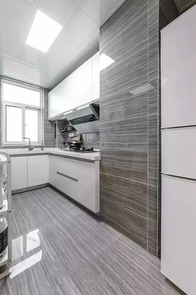 廚房墻面地面用的灰色磚,搭配上白色櫥柜,還有U型的操作臺(tái),整個(gè)空間簡(jiǎn)約大方又實(shí)用,讓做飯的心情松。都格外的輕松。