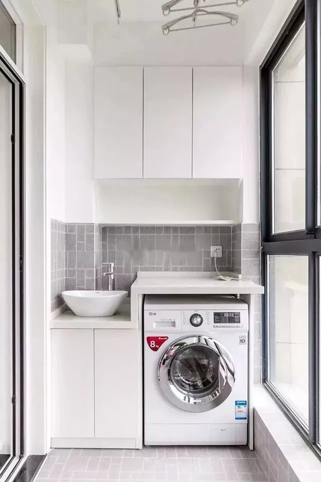 陽(yáng)臺(tái)墻面和地面用的灰色磚,洗衣機(jī)與洗手盆組合一起,上方還裝個(gè)吊柜,整體簡(jiǎn)潔大方又實(shí)用。