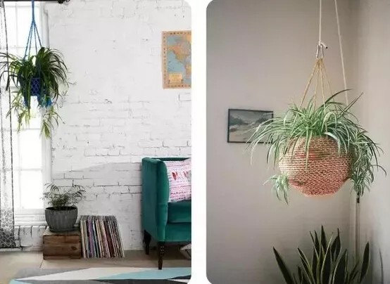 審美:吊蘭葉片細(xì)長柔軟,從葉腋中抽生出小植株,由盆沿向下垂,舒展散垂,似花朵,因此吊掛起來能更好地配合它的生長姿態(tài)。