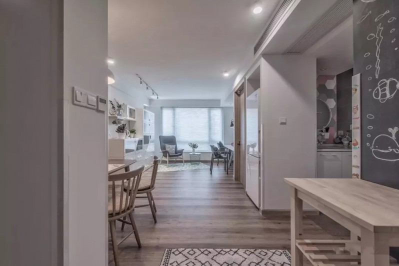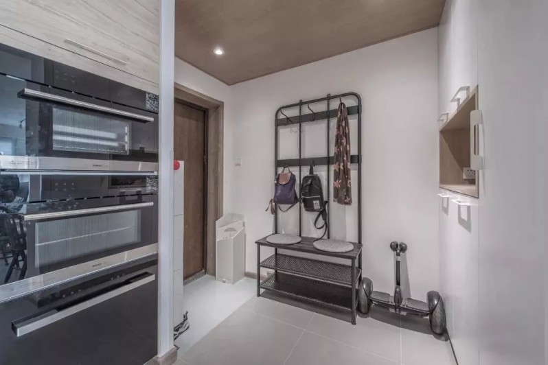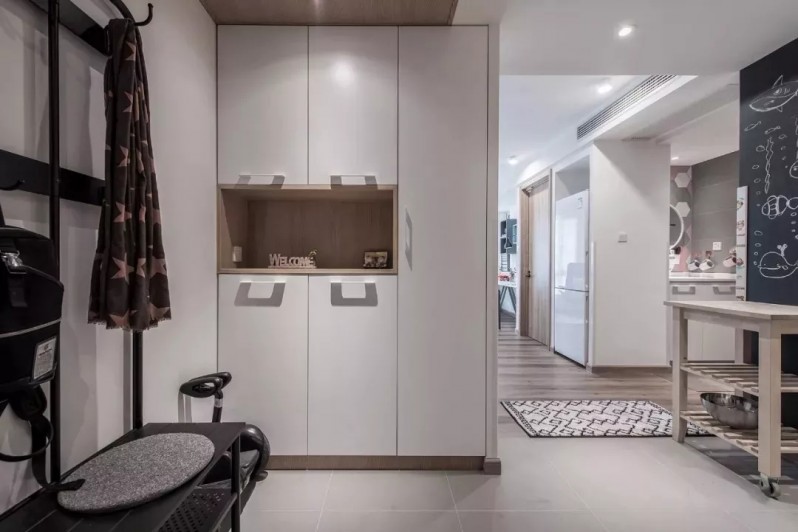 原始戶型開門見廳,設計師在正對門的位置安裝了一道白色儲物柜,隔絕視線的同時,提高了空間的儲物能力。