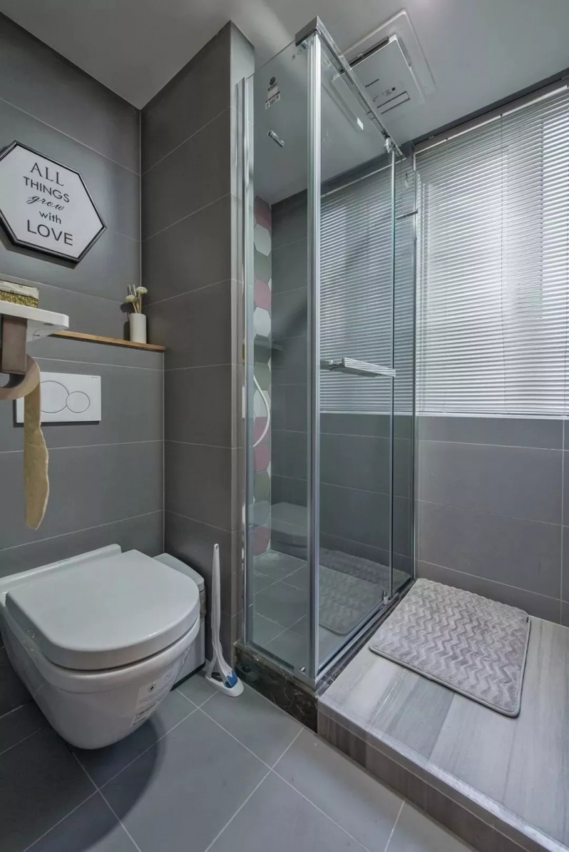 淋浴區(qū),六邊形拼色瓷磚與干區(qū)呼應,墻排馬桶上方加入木面置物臺。
