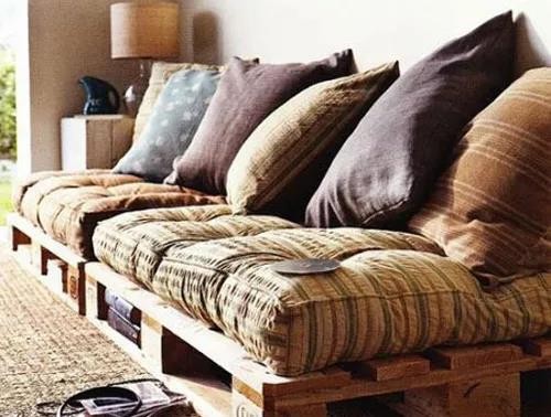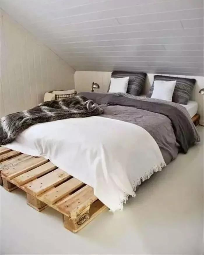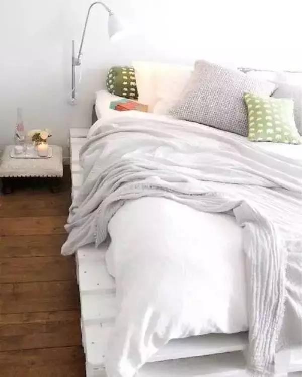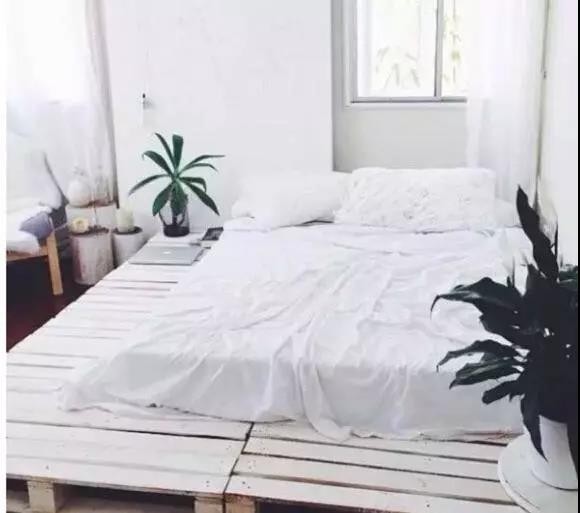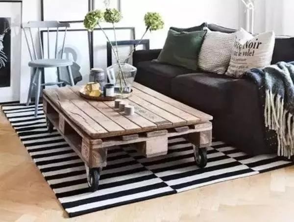 ▲ 一整塊大的墊倉板直接就可以充當(dāng)床板;墊倉板裝上滑輪,當(dāng)一個(gè)靈活的茶幾。搭配北歐風(fēng)的簡約布藝沙發(fā),清爽文藝。