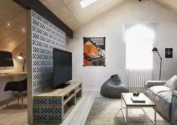 ▲ 將水泥空心磚進(jìn)行打磨處理,壘起來就是一面典型的工業(yè)風(fēng)電視背景墻,粗獷中又有時(shí)尚感