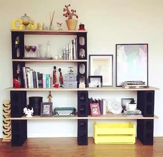 ▲ 水泥空心磚與擱板組合而成的擱物架和書柜,水泥工業(yè)風(fēng)也能變身文藝北歐范。