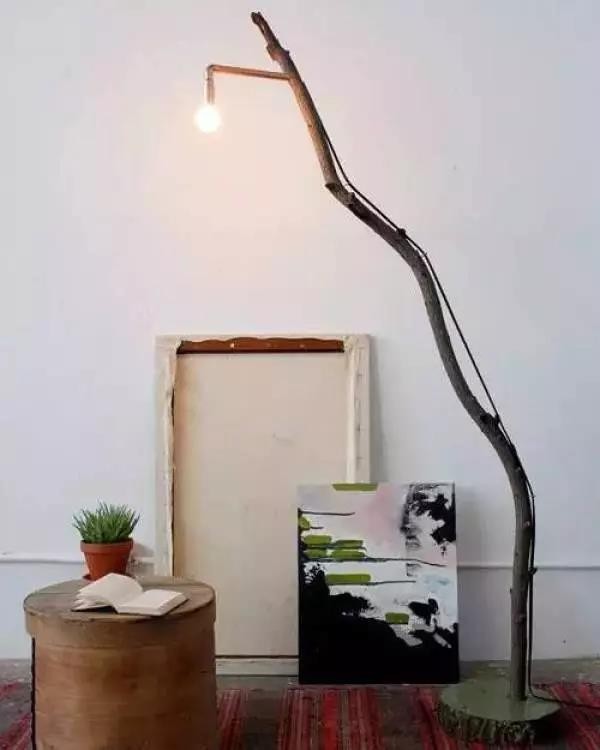 ▲ 樹枝DIY落地?zé)?,燈座可以用水泥澆灌,然后直接在樹枝上固定住電線繩子就可以