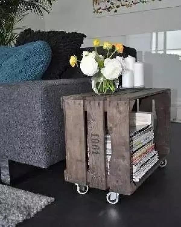 ▲ 板條箱的簡單堆積組成的邊柜。建議在碼板條箱的時(shí)候,可以用強(qiáng)力膠水或者釘木板的工具進(jìn)行固定,避免單個(gè)翻落砸傷自己