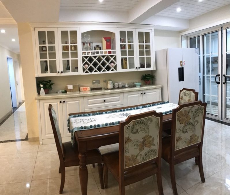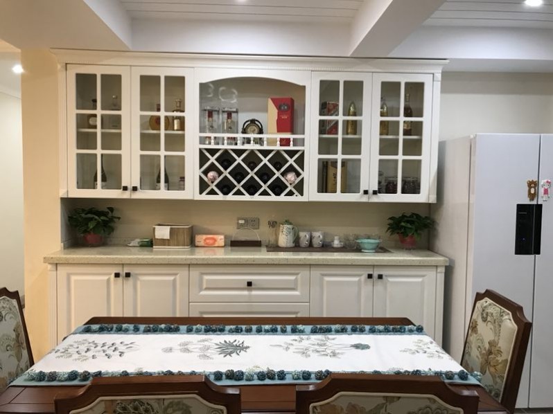 廚房空間有限,為了擴(kuò)大廚房的操作空間,冰箱放在餐廳,與酒柜融為一體,功能與美觀兩不誤。在餐廳空間允許的條件下,設(shè)置定制酒柜來(lái)容納楊姐隨時(shí)的一些東西。其中,吊柜的多種造型滿足不同種類(lèi)的物件擺放。
