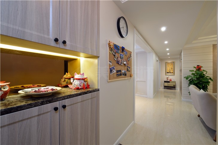 主臥壁上采用了淺奶茶色的格調(diào),搭配上實木的地板,另外一張敦實的米色大床看上去也是非常精致大氣的,搭配上清新的被褥,顯得非常的溫馨舒適,床頭掛了業(yè)主的結(jié)婚照畫,非常的溫馨漂亮。