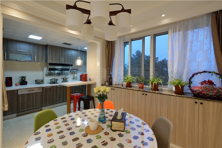廚房墻壁上采用了白色的瓷磚,餐廳多種顏色的搭配看上去非常的時尚有活力,櫥柜將廚房的空間充分的利用起來,顯得非常的寬敞舒適,棕色的櫥柜搭配上高級灰的大理石臺面,顯得非常的精致漂亮。