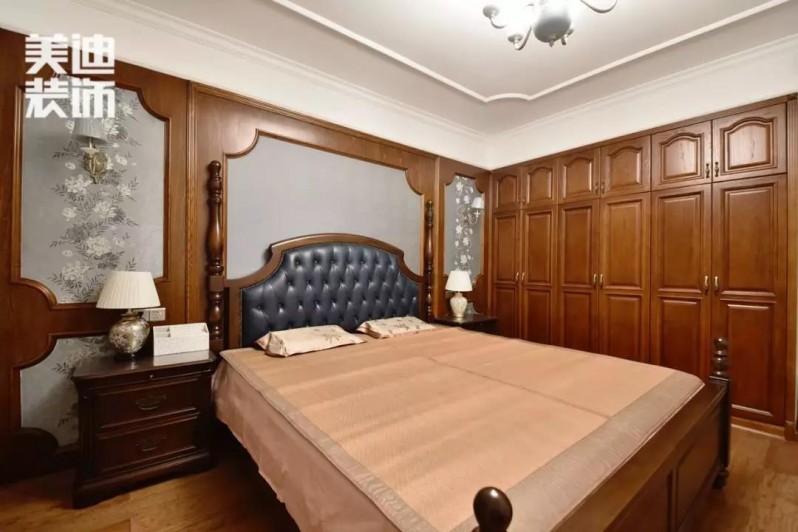 主臥沒有過多繁復(fù)的裝飾,實(shí)木地板、美式鄉(xiāng)村風(fēng)復(fù)古臺燈、典雅的壁紙等都給空間增添了古典優(yōu)雅的韻味,營造溫馨自然的睡眠環(huán)境。