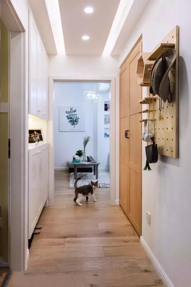 ▲玄關(guān)墻壁上制作了一個(gè)木制儲(chǔ)物架,可以用來掛帽子、圍巾等等,這樣就節(jié)省了衣帽間的空間,并且能好好歸類。