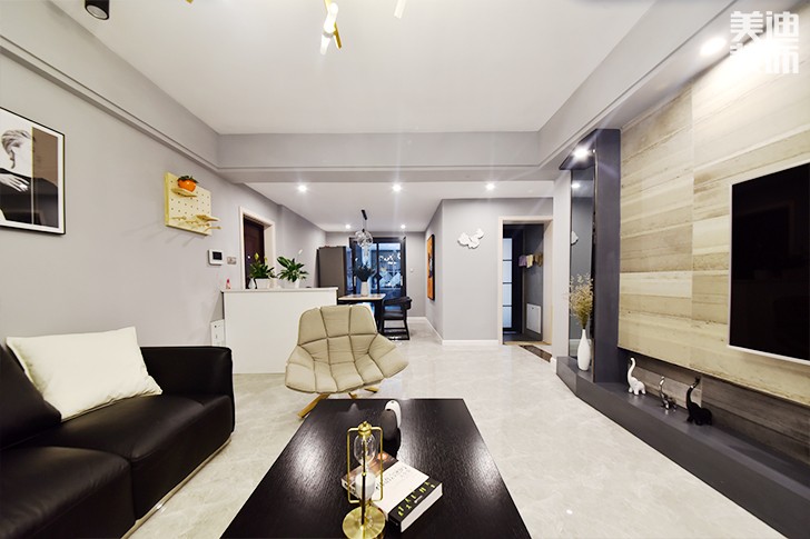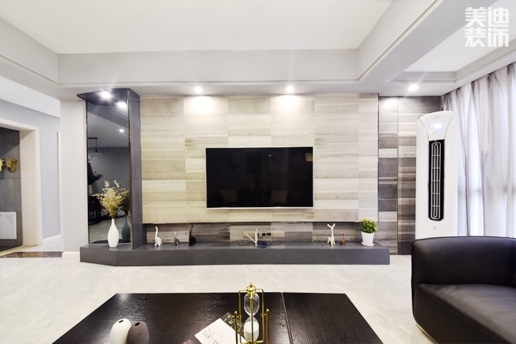 李玲琳設計師在電視背景墻這塊花了很多心思,采用的是電視背景墻與墻面顏色相協(xié)調,加上具有藝術感的小擺件,將毛葉女士的干練毫無保留的展現(xiàn)在設計中,也滿足了毛葉女士喜歡簡單設計的需求。