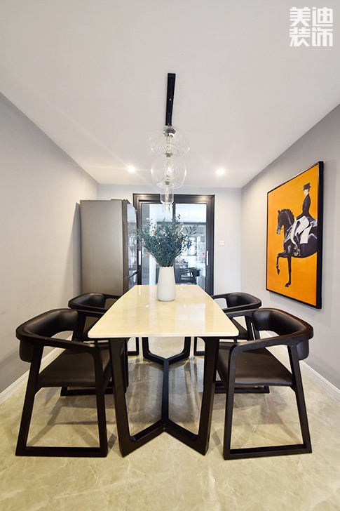 采用簡單的桌椅,搭配著極具設計感的玻璃吊燈;墻面上的橘色掛畫,既解決墻面單調的問題,給人展現(xiàn)出摩登的現(xiàn)代氣息,又增添了幾分清新自然的視覺感受。