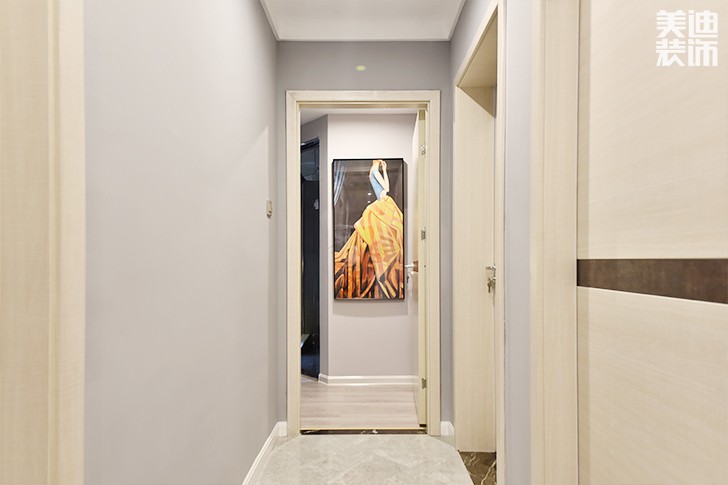 然后入眼的是淺灰色的墻面,打破傳統(tǒng)白墻的設計,灰色系的墻面由于顏色比較淺,在施工現(xiàn)場調了幾次色,在墻上刷了4遍才刷出來滿意的效果;個性感十足的裝飾畫,即打破了墻體的單調性,又增添了幾分藝術的色彩。