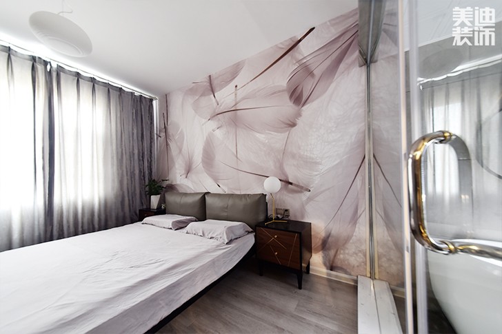 本案戶型雖然只有115平米,但有4個房間;李玲琳設計師為了解決主臥和主衛(wèi)空間并不是特別寬敞這個問題,便從材質運用上出發(fā),將主衛(wèi)的隔墻改成了全清玻璃材質的隔斷;并且結合爵士白的地臺,給主臥空間帶來簡潔的現(xiàn)代氣息,視覺上感覺房間更敞亮。