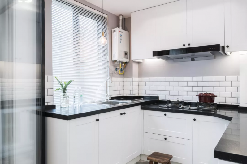 廚房內(nèi)部是U字型的櫥柜布局,白色的柜體、黑色的臺面和小白磚、花磚、灰色墻漆的運(yùn)用,讓廚房的層次分明,折疊門的使用也讓廚房平時更顯寬敞。