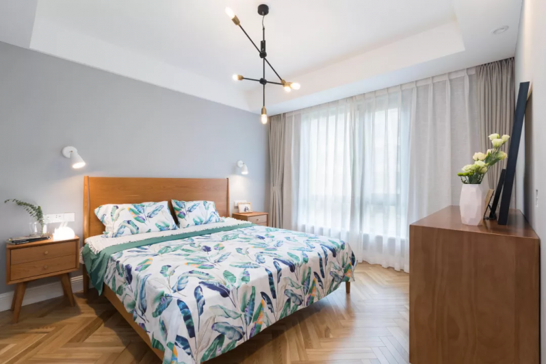 臥室內(nèi)溫馨原木與清新被單的搭配相得益彰,一盞簡約吊燈,簡單明了的同時營造出自由舒暢的臥室氛圍。