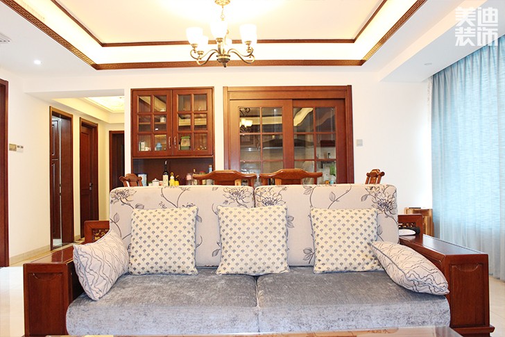 ▲整間房屋以沉穩(wěn)的木色調(diào)為主,再結(jié)合沙發(fā)和窗簾的淺色搭配,一深一淺,不覺違和反而有種融洽的美感。客廳采用的是簡單又實(shí)用的布藝沙發(fā),配上古風(fēng)古韻的荷花圖案,詩情畫意的場(chǎng)景油然而生??蛷d桌子也延用深色調(diào),下方抽屜的花紋設(shè)計(jì)和側(cè)面的鏤空?qǐng)D案,都是中式風(fēng)格不可缺失的元素,古風(fēng)古韻、深沉又不失清新,便是它的特色所在。