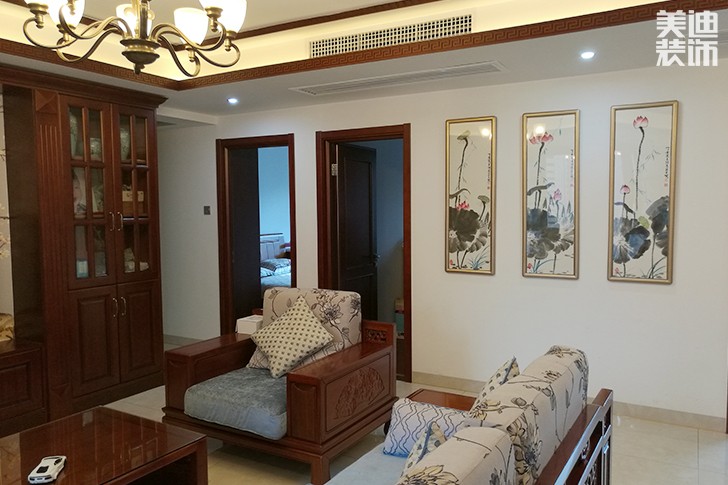 ▲墻上再掛上幾幅荷花圖,既與沙發(fā)圖案遙相呼應(yīng),也使墻上空間豐富、文藝不少。