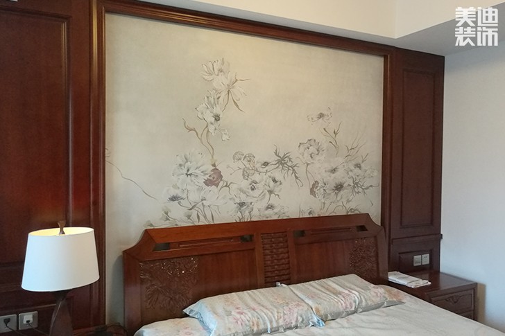 ▲主臥的背景墻依舊是充滿古韻的圖案,配上實(shí)木色調(diào)的家具和淺色素雅的床上用品,深淺搭配,好有意境。