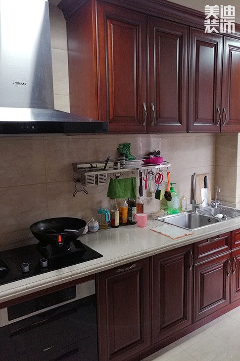 ▲廚房是一個(gè)封閉空間,設(shè)計(jì)師充分考慮到廚房空間的實(shí)用性,所以配置了多個(gè)收納柜和臺(tái)面收納架,雙水槽的設(shè)計(jì)也非常合理。