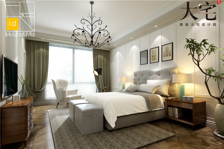 臥室設(shè)計在頂層,淺綠色的窗簾和白色的床上用品,凸顯主人高雅的品味。