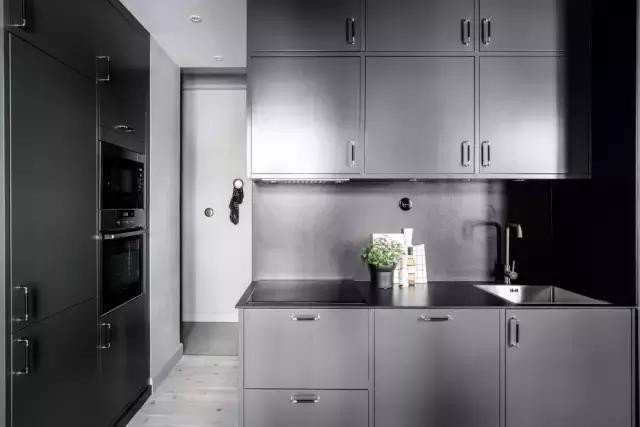 整個(gè)開(kāi)放式的廚房也是做了嵌入式的柜子,灰黑色的櫥柜和灰木色的地板、白色的天花板形成層次感,讓整個(gè)空間更顯寬敞,也更不會(huì)壓抑。