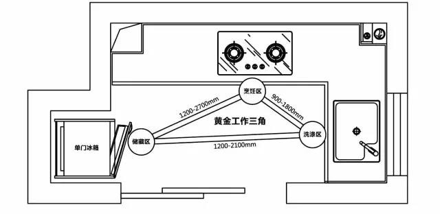 根據(jù)廚房使用動(dòng)線規(guī)劃:取材、摘理、洗滌、切配、烹飪、盛放六步進(jìn)行臺(tái)面設(shè)計(jì),儲(chǔ)藏區(qū)、洗滌區(qū)、烹飪區(qū)使用頻率最高,合理動(dòng)線設(shè)計(jì)形成“黃金工作三角區(qū)”。
