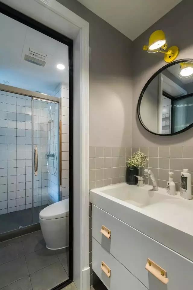 ▲實(shí)木智能整裝·衛(wèi)生間丨櫻草花黃,與沉穩(wěn)飽滿的灰色和亮白搭配,讓空間呈現(xiàn)一種恬靜、安謐的氛圍。