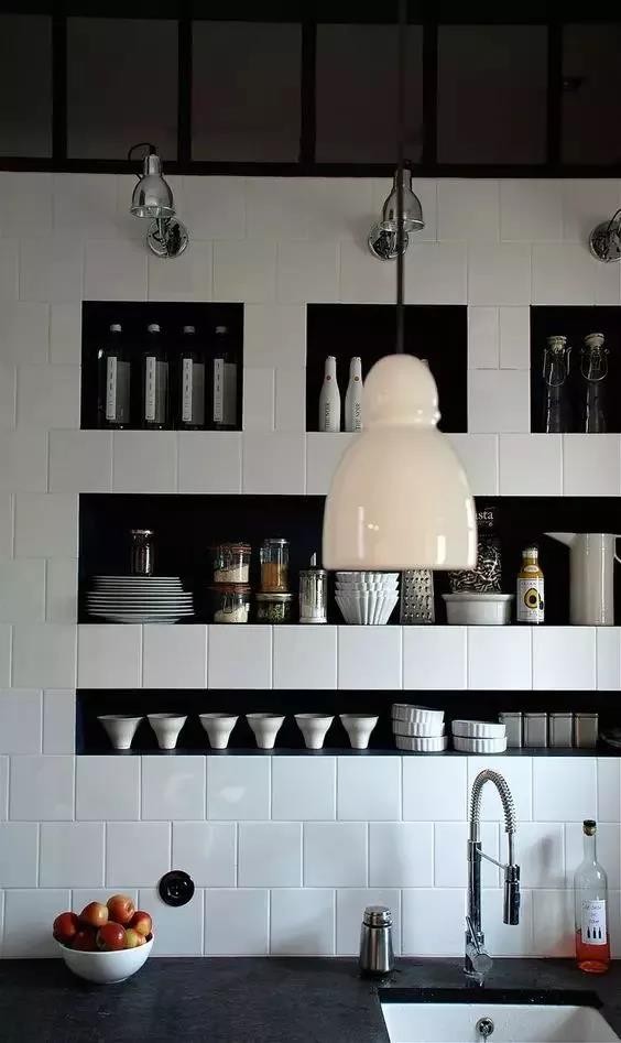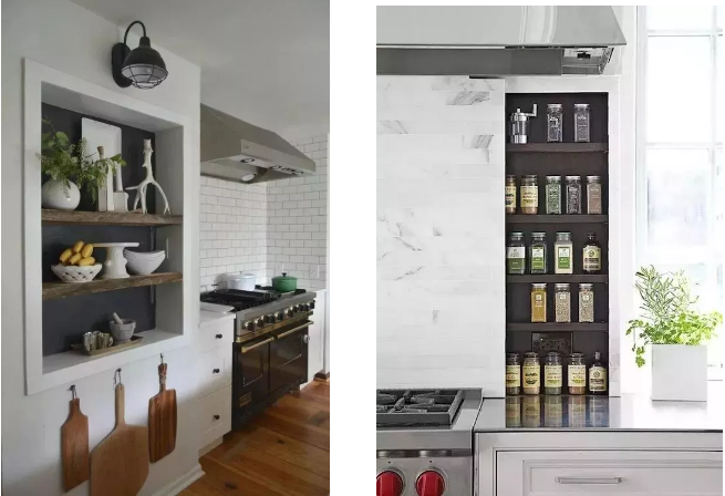 廚房講究的是方便、美觀、實(shí)用、設(shè)計(jì)一個(gè)壁龕,放一些碗盤子和各種瓶瓶罐罐。不過廚房壁龕一定要用瓷磚這種易清理的材質(zhì),同時(shí)在做之前需提前想好壁龕內(nèi)部貼什么瓷磚。