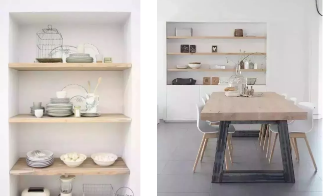 總會(huì)有些杯盤碗碟放在餐桌的角落邊,感覺雜亂無章,不如造個(gè)餐邊柜壁龕吧!不管是餐具還是擺件都可以放進(jìn)去,美觀又實(shí)用!