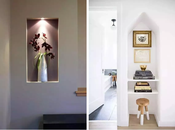 正對(duì)大門空空的墻面覺得沒有情調(diào),制作壁龕、安裝幾盞小壁燈、放上精心挑選的裝飾品,情調(diào)馬上營造出來,推門進(jìn)屋就是滿滿的好心情。