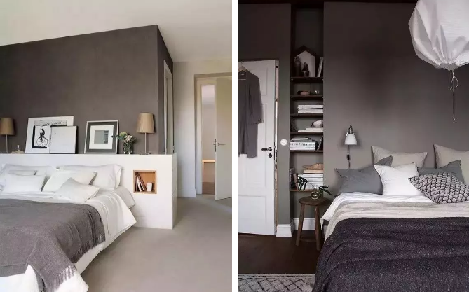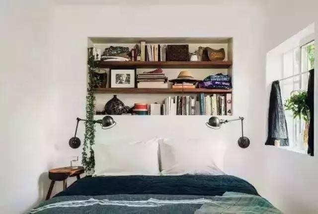 如果是在床頭兩邊和床頭上做壁龕,這下連床頭柜都省了。除了儲(chǔ)物,還可以為臥室?guī)愍?dú)特的感覺。